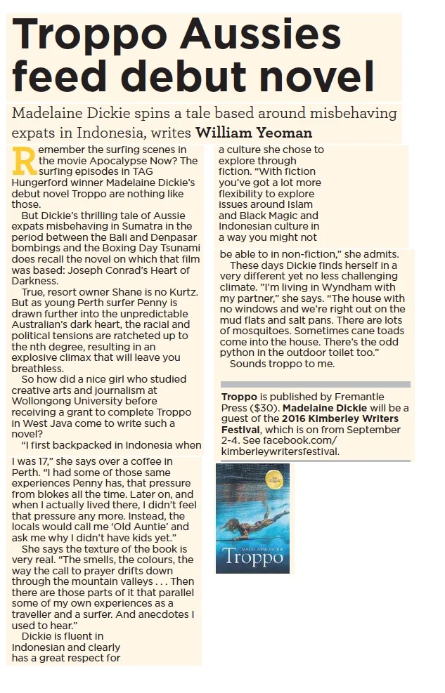 In the hands of West Australian writer Madelaine Dickie, Troppo is a sinewy take on the people next door seeing Indonesians as humans with flaws and qualities, not economic units in a government statement.