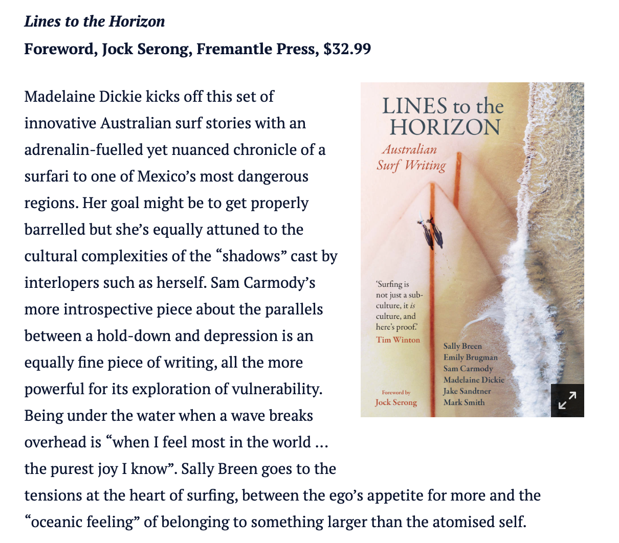 Nothing stops Madelaine Dickie getting waves... not rat-sized spiders, or even being 34-weeks pregnant. She's one of six Aussie authors who have published their sun-soaked and salty surf stories in a new book, "Lines to the Horizon" published by Fremantle Press. Madelaine tells Molly Schmidt why even the shore bound will enjoy this book.